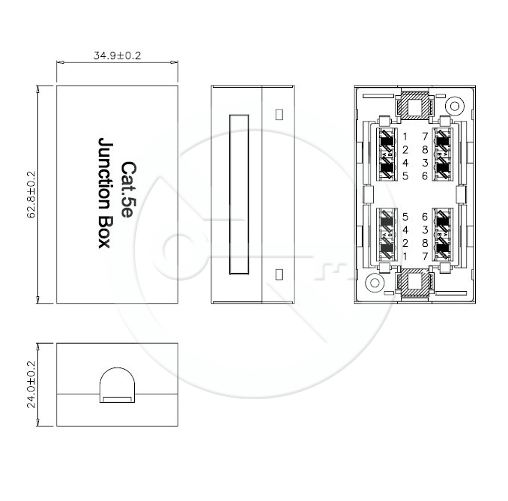 Boksy połączeniowe można zastosować do prostego połączenia lub przedłużenia cztero-parowego kabla instalacyjnego CAT5E. Do boksu połączeniowego z listwą zaciskową Krone można podłączać przewody typ drut o wielkości AWG 26 – 22. Wymiary 63mm (szer) x 35mm (gł.) x 24mm (wys).