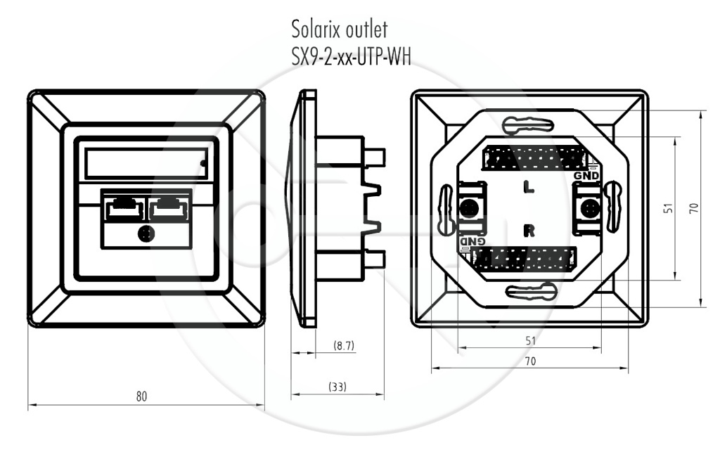 Gniazdka SX9 tworzą ważną część składową serii produktowej Solarix – kategoria 5E. Gniazdka wykonane są w stylu German Style a ich parametry spełniają wymagania specyfikowane w standardach międzynarodowych ANSI/TIA 568, ISO/IEC 11801 a EN 50173 dla kategorii 5E i klasy przewodów Class D, włącznie z wszystkimi najnowszymi dodatkami. Gniazdka SX9 oferują wysoką niezawodność, maksymalną funkcjonalność i bardzo prostą instalację. Są obłożone jednym lub dwoma portami RJ45 z nachyleniem 45°. Przewody o wielkości AWG 26 – 22 są mocowane do listwy zaciskowej typu Krone. Styki na listwie zaciskowej oznaczone są kolorowym schematem według standardu T568A, lub T568B. Gniazdka SX9 systemu Solarix – kategorii 5E są dostępne tak w nieekranowanej jak i ekranowanej wersji i są przeznaczone pod tynk. Przy zastosowaniu boksu SX9-0-WH można ten typ gniazdka zastosować także do instalacji na tynk. Standardowo gniazdka i boksy są produkowane w kolorze białym.
