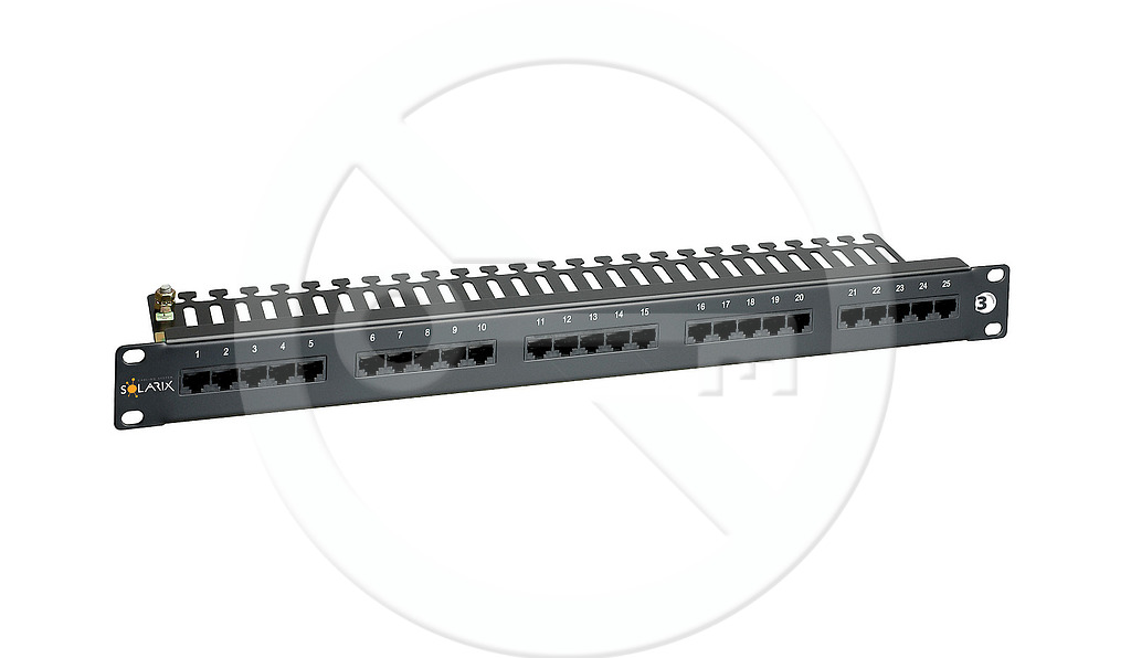 Patch panel Solarix ISDN SX25-ISDN-BK przeznaczony jest do tej części okablowania strukturalnego, która służy do połączenia stanowisk roboczych do centrali telefonicznej. Panel posiada 25 portów typu RJ45 i dualnych złącz typu 110/Krone. Częścią panela jest wspornik umożliwiający pewne zamocowanie kabla telefonicznego do korpusu patch panela. Do zalet patch paneli Solarix należą wysoka niezawodność, trwałość, a przede wszystkim łatwy w instalacji. Panele spełniają wszystkie wymagania dla kategorii 3. Dostępne są w kolorze czarnym, wysokość w szafie - 1U.