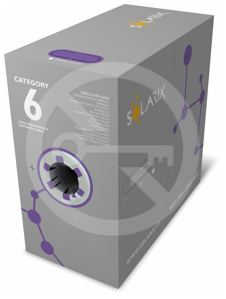 Kabel instalacyjny Solarix o oznaczeniu SXKD-6-UTP-LSOH to niezawodny kabel nieekranowany kategorii 6 testowany do 450 MHz, przeznaczony do pracy z protokołami Ethernet, w tym 2,5GBASE-T i 5GBASE-T. Konstrukcja kabla to U/UTP z plastikową krosownicą zapewniającą maksymalne odseparowanie par od siebie na całej długości kabla. Typ płaszcza to LSOH o klasie reakcji na ogień Dca-s2,d2,a1. Żyły kabla wykonane są z wysokiej jakości drutu miedzianego o czystości 99,97% miedzi. Kabel z łatwością spełnia wymagania międzynarodowych norm ISO/IEC 11801, EN 50173 oraz ANSI/TIA 568.2-D. Parametry użytkowe tego kabla zostały sprawdzone przez niezależne laboratorium badawcze FORCE TECHNOLOGY w ramach programu EC Verified na najwyższym poziomie, tzw. Component Level. Certyfikat jest dostępny tutaj na stronie internetowej w zakładce "Do pobrania" lub bezpośrednio na stronie laboratorium FORCE. W przypadku CPR (Rozporządzenie UE 305/2011), kabel jest badany w systemie oceny parametrów AVCP 3. Podobnie jak inne kable Solarix, kabel SXKD-6-UTP-LSOH jest oznaczony wskaźnikiem metrowym w odstępach co 1 m od 0 do 305 m. Kabel dostarczany jest w bardzo trwałym trójwarstwowym kartonie polerowanym, na którym znajdują się wszystkie niezbędne informacje o produkcie, w tym kody kreskowe, seria, opis i najważniejsze parametry techniczne.