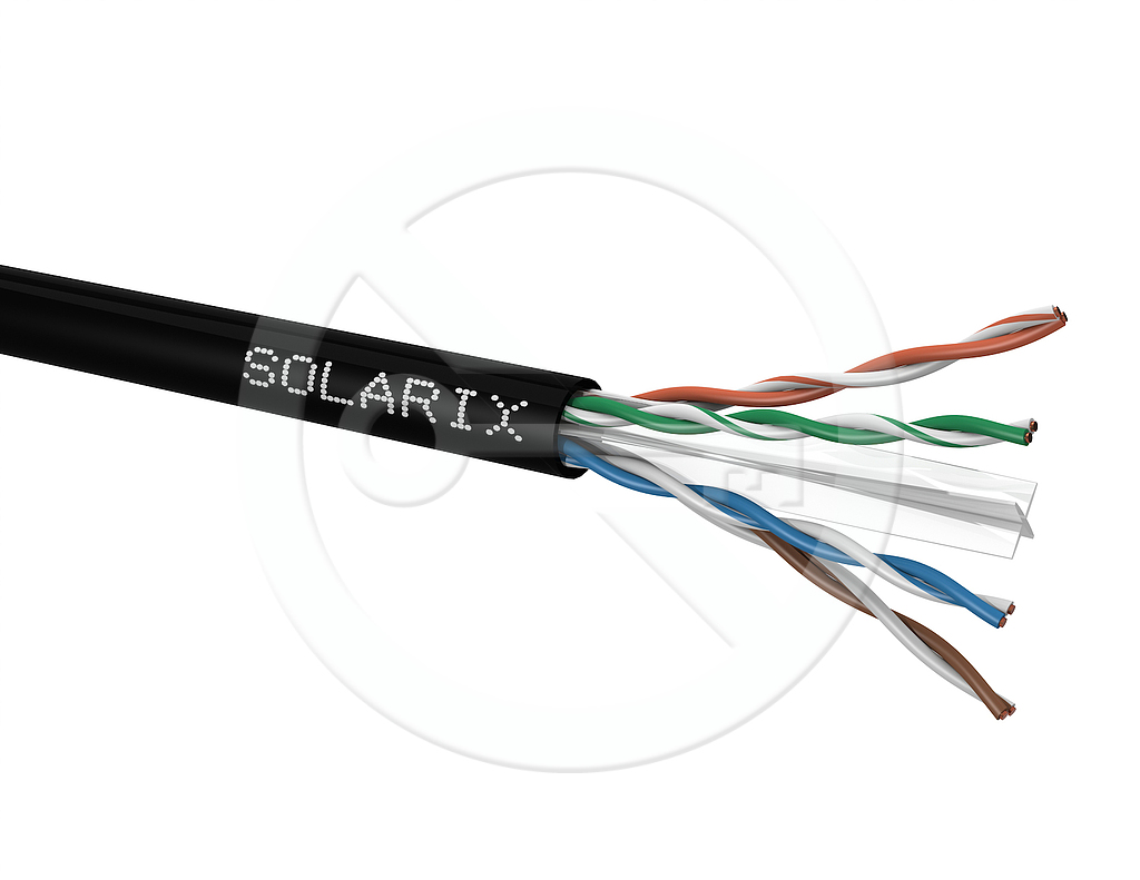 Kabel instalacyjny Solarix – kategoria 6 z oznaczeniem SXKD-6-UTP-PE to zewnętrzny ekranowany kabel z płaszczm polietylenowym przeznaczony dla najbardziej wymagających instalacji, w których konwencjonalny kabel z płaszczem PCV czy LSOH nie zapewnia wystarczającej ochrony przed wpływem warunków atmosferycznych na kabel. Kabel bez problemu spełnia i również przewyższa wymagania specyfikowane w standardach międzynarodowych ANSI/TIA 568, ISO/IEC 11801 i EN 50173 dla kategorii 6 i klasy przewodów Class E, włącznie z wszystkimi najnowszymi dodatkami. Kable Solarix - katgorii 6 dostępne są w wersji ekranowanej jak i nieekranowanej oraz z różnymi typami powłoki - tj. PVC (klasa reakcji na ogień Eca), LSOH (klasa reakcji na ogień Dca s2 d2 a1) lub UV stabilne PE (klasa reakcji na ogień Fca). Żyły kabla wyprodukowane zostały z bardzo wysokiej jakości drutu miedzianego o wielkości AWG 23. Poszczególne wiązki/pary kabla są oddzielone plastikowym krzyżem. Kabel SXKD-6-UTP-PE posiada oznaczenia długości co 1 m i jest nawinięty na solidną drewnianą szpulę, która zawiera wszystkie niezbędne informacje o produkcie w tym kody kreskowe, numer produkcyjny oraz główne parametry techniczne.
