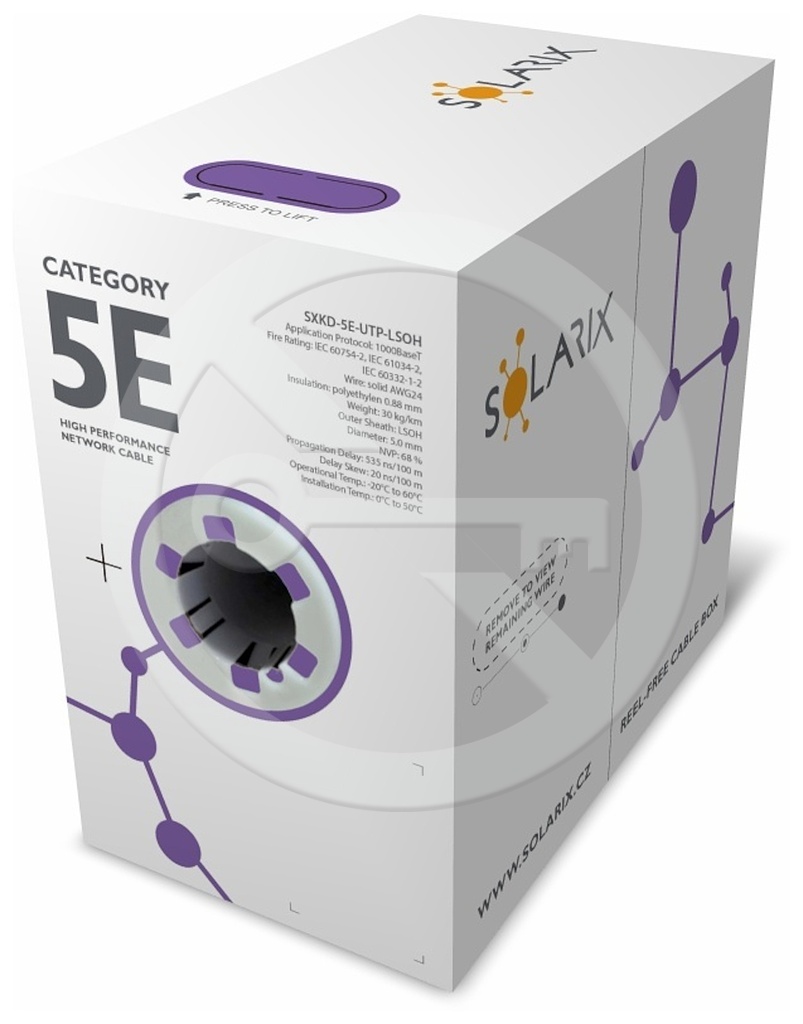 Kabel instalacyjny Solarix, oznaczony jako SXKD-5E-UTP-LSOH, to niezawodny nieekranowany kabel kategorii 5E, który został przetestowany pod kątem przepustowości do 350 MHz i jest przeznaczony do obsługi protokołów Ethernet, w tym 2,5GBASE-T i 5GBASE-T*. Konstrukcja kabla to U/UTP, typ płaszcza LSOH z klasą reakcji na ogień Dca-s1,d2,a1. Żyły kabla wykonane są z wysokiej jakości drutu miedzianego o czystości 99,97%. Kabel z łatwością spełnia wymagania międzynarodowych norm ISO/IEC 11801, EN 50173 i ANSI/TIA 568.2-D. Parametry tego kabla zostały przetestowane przez niezależne laboratorium testowe FORCE TECHNOLOGY w ramach programu EC Verified na najwyższym poziomie, tzw. Component Level. Certyfikat jest dostępny tutaj w zakładce "Do pobrania" lub bezpośrednio na stronie laboratorium FORCE. W przypadku CPR (Rozporządzenie UE 305/2011) kabel jest testowany w systemie oceny wydajności AVCP 3. Podobnie jak inne kable Solarix, kabel SXKD-5E-UTP-LSOH jest oznaczony metrową podziałką co 1 m w zakresie od 0 do 305 m. Kabel jest dostarczany w bardzo wytrzymałym trójwarstwowym pudełku z polerowanego kartonu (zawsze oznaczonym kolorami zgodnie z typem kabla), na którym znajdują się wszystkie niezbędne informacje o produkcie, w tym kody kreskowe, partia produkcyjna, opis i najważniejsze parametry techniczne.