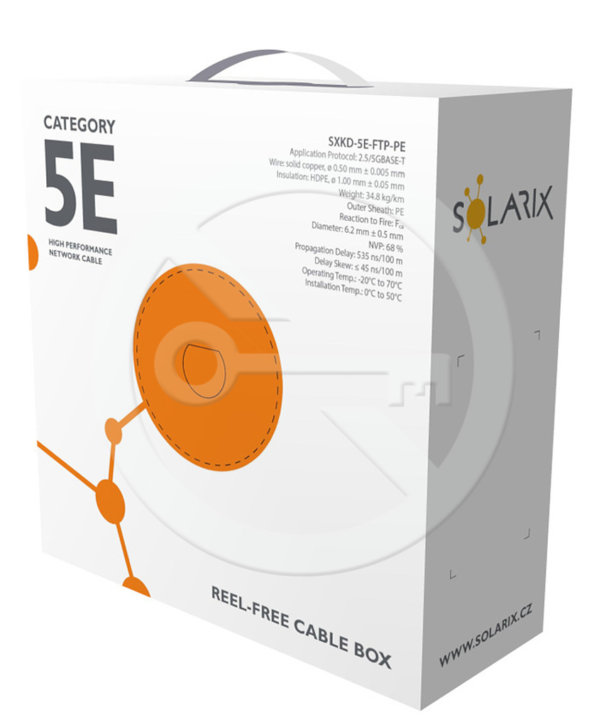 Kabel instalacyjny z oznaczeniem SXKD-5E-FTP-PE jest kablem CAT5E z powłoką PE. Stosuje się go na zewnątrz, gdzie kable z powłoką PVC czy LSOH nie zapewniają odpowiedniej ochrony przed warunkami atmosferycznymi. Wspólnie z pozostałymi komponentami systemu okablowania strukturalnego Solarix stwarza rozwiązanie, które zapewnia długi czas użytkowania, maksymalną wydajność i bezproblemowy ruch w sieci komputerowej. Kable instalacyjne Solarix – kategoria 5E są przeznaczone dla połączeń horyzontalnych i są oferowane w wersji ekranowej i nieekranowanej z różnym typem osłony - tj. PVC (klasa reakcji na ogień Eca), LSOH (klasa reakcji na ogień Dca s1 d2 a1) lub UV stabilne PE (klasa reakcji na ogień Fca). Kable te bez problemów spełniają wymagania definiowane w standardach międzynarodowych ANSI/TIA 568, ISO/IEC 11801 i EN 50173 dla kategorii 5E i klasy przewodów Class D, włącznie z wszystkimi najnowszymi dodatkami. Podobnie jak w przypadku innych kabli Solarix przewód SXKD-5E-FTP-PE ma oznaczenia na powłoce PE co jeden metr w zakresie od 0 do 100 metrów. Kabel ten jest dostarczany w utwardzonym trójwarstwowym kartonie (oznakowany kolorami w zależności od typu kabla), który zawiera wszystkie niezbędne informacje o produkcie, w tym kody kreskowe, numery partii produkcyjnej, opis i główne parametry techniczne.