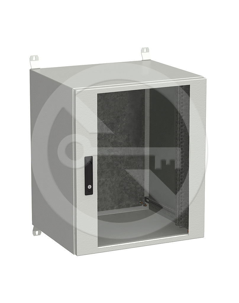 Rozdzielnica składa się z samonośnej konstrukcji spawanej z blachy o grubości 1,5 mm, która jest przystosowana do montażu naściennego za pomocą czterech dołączonych zawiasów. Drzwi zabezpieczone są przed otwarciem zamkami cylindrycznymi jednopunktowymi lub zamkiem trzypunktowym, klamką składaną z wkładką. Po wewnętrznej stronie drzwiczek przyspawane są dwie pionowe, perforowane ramy, które zwiększają sztywność i jednocześnie służą do odwiązywania i mocowania wyposażenia szafy. Połączenie uziemienia szafy wykonane jest nowoczesną technologią zgrzewania pojemnościowego śrubami metalizowanymi. Drzwi są uszczelnione za pomocą technologii uszczelnienia odlewanego. Urządzenia można montować w szafie na szynach 19 "wykonanych z blachy ocynkowanej. W tylnej części szafy znajduje się również panel montażowy wykonany z blachy ocynkowanej gr. 2 mm. Szyny 19" oraz panel montażowy regulowany w sposób ciągły na wymaganą głębokość w szafie. Jeśli konieczne jest wbudowanie go w ścianę, rozdzielnicę można uzupełnić ramą natynkową.